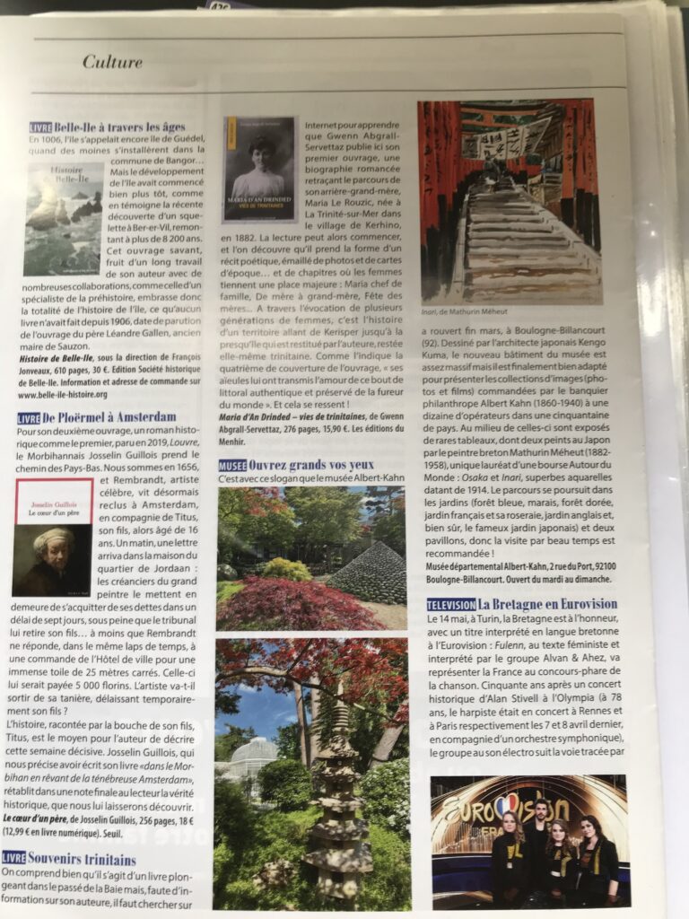 Article du Journal des propriétaires de la Baie de Quiberon sur mon livre Maria d’An Drinded, vies de Trinitaines