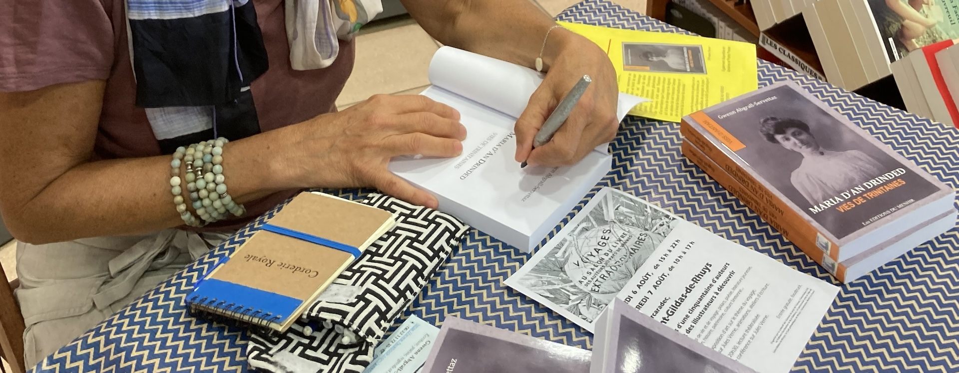 Depuis quelques années, je consacre temps et énergie à ma passion pour la littérature et l’histoire : j’ai entrepris en 2019 de raconter la vie de mes aïeules maternelles et de leur village, La Trinité-sur-mer. Ce projet est devenu un livre, Maria d’An Drinded, vies de Trinitaines, publié en 2021 aux Éditions du Menhir.